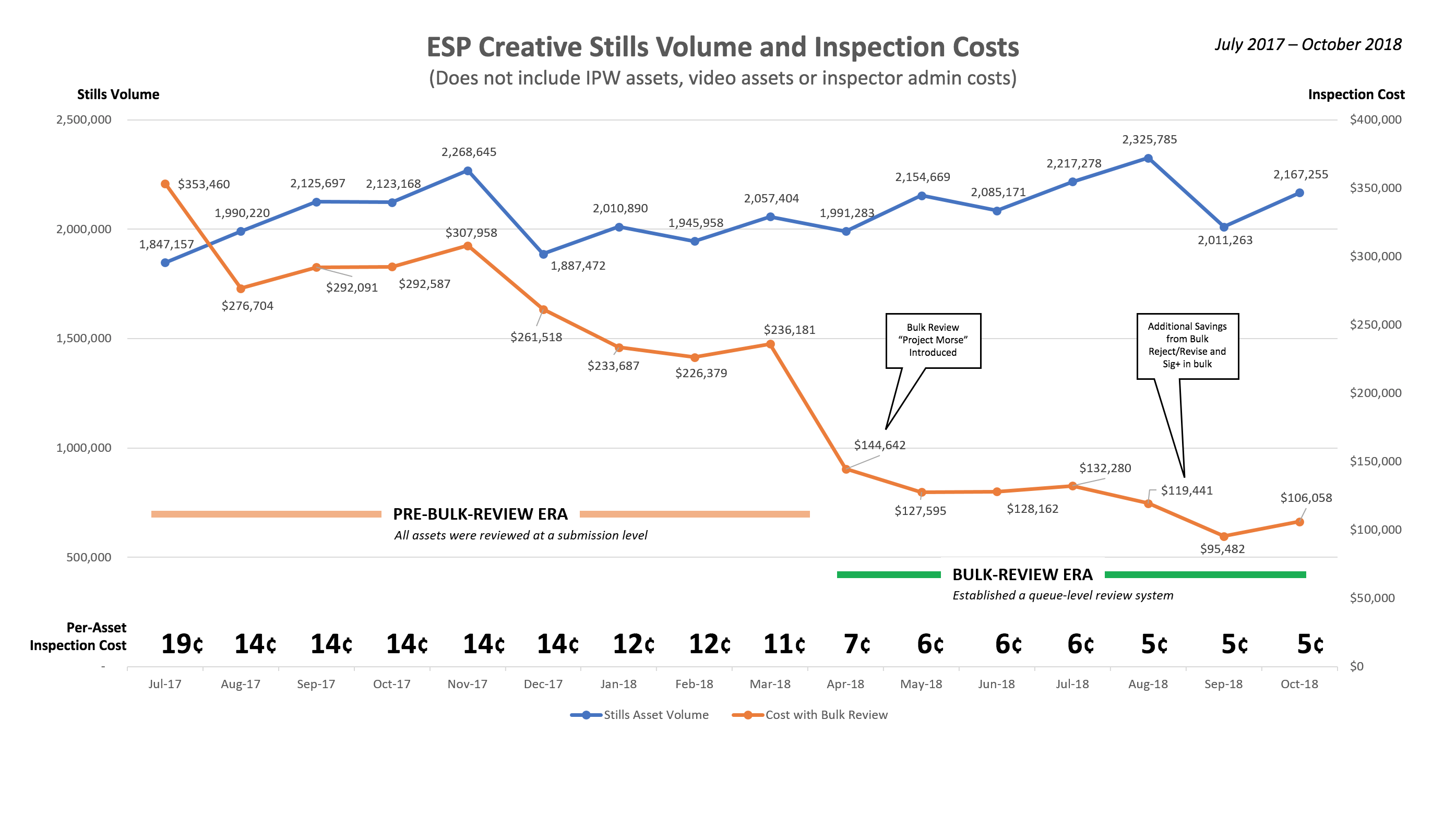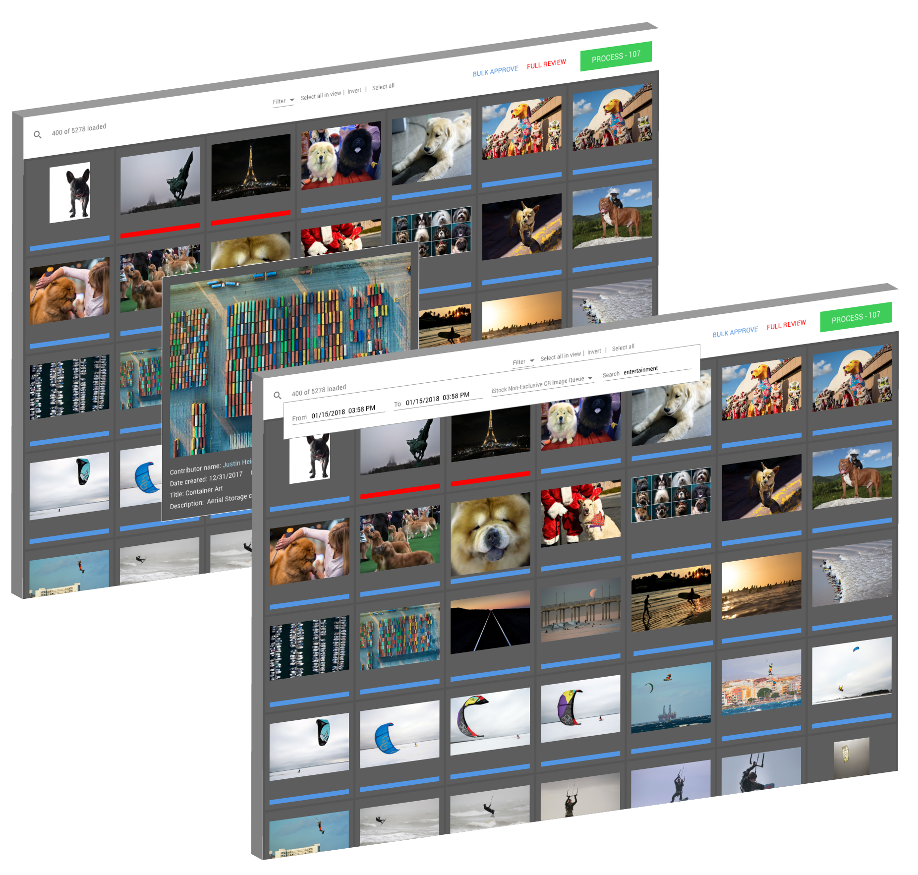 To achieve this we started scoring all assets before they got to the inspection stage, assets above a certain threshold are auto-approved and those below the threshold are put into an inspection queue. The inspection queue is then reviewed by a Getty Images inspector looking for "bad" images. Bad images are flagged and sent off to another process. The remainder of images in the queue are then bulk approved and published. This project is saving Getty Images over one million dollars in 2018 and inspector feedback has been overwhelmingly positive.